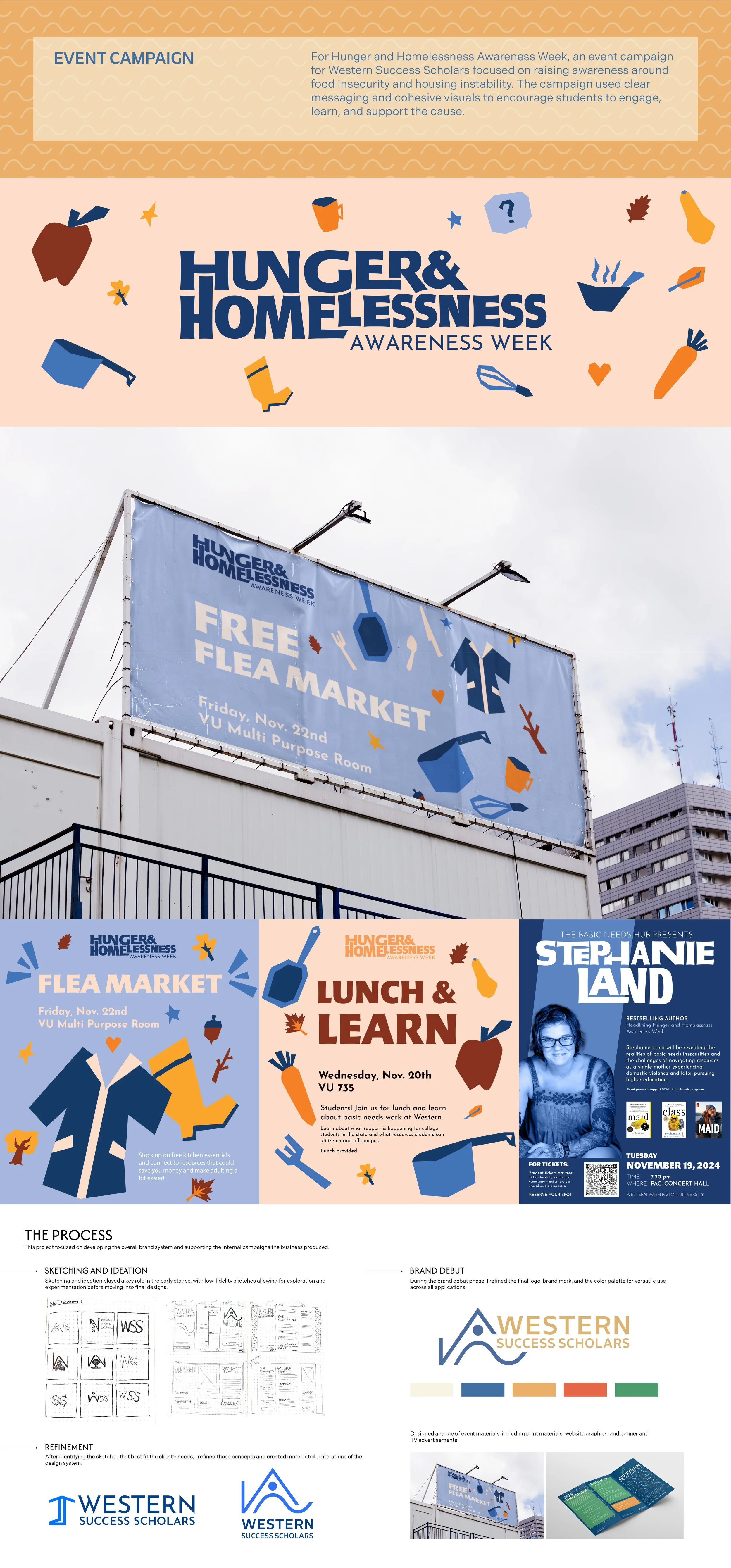 For Western Success Scholars, an organization dedicated to supporting students with experiences in foster care and homelessness, a cohesive brand identity was created, along with various print materials. The project also included developing visual campaigns for campus initiatives, such as Hunger and Homelessness Awareness Week.